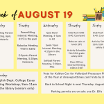 Here are your events for the week of August 19: Monday, August 19: Wrestling parent meeting, 6pm in the cafeteria Tuesday, August 20: Powerlifting interest…