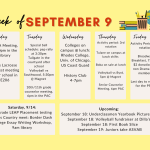 Here are your events for the week of September 9: MONDAY, September 9: PTSA meeting in the library at 5:30pm, Girls Lacrosse interest meeting after school…