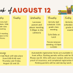 Here are your campus events for the week of August 12: We will be on activity bell schedule on Monday, Thursday, and Friday of this…